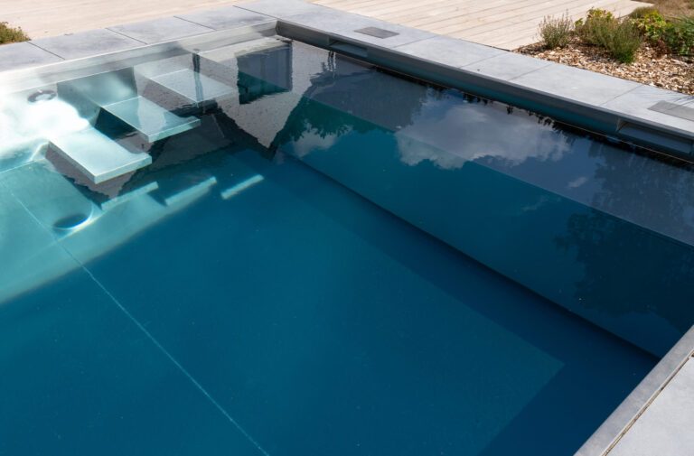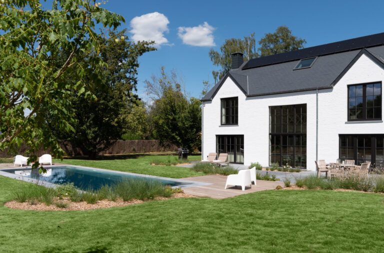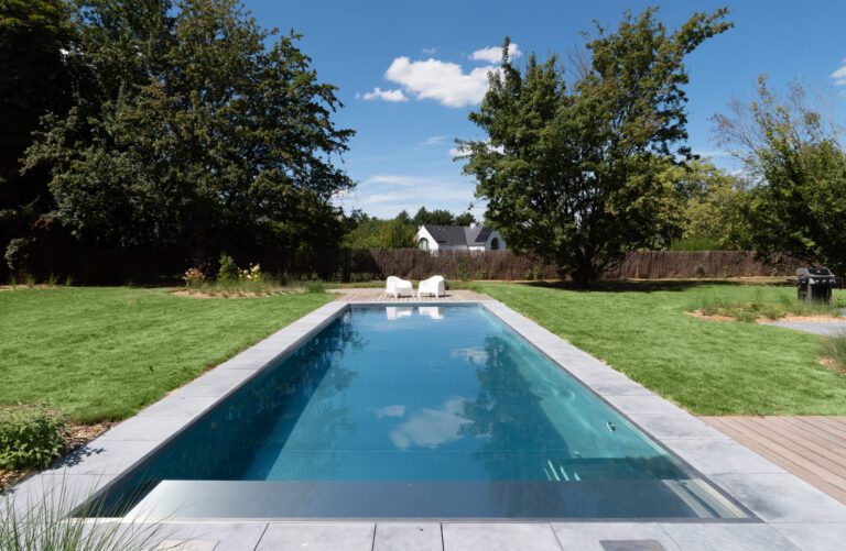 La finition intemporelle des bords en pierre bleue et en bois dur confère à la piscine une apparence élégante qui s’intègre parfaitement aux éléments naturels du jardin. Deux spacieuses terrasses aux extrémités de la piscine offrent un prolongement visuel de l’ensemble. Les matériaux de haute qualité garantissent non seulement un aspect haut de gamme, mais également une durabilité et une longue durée de vie.