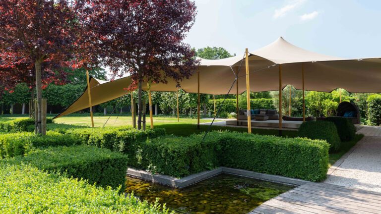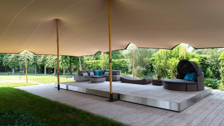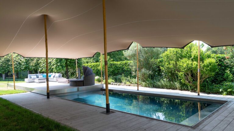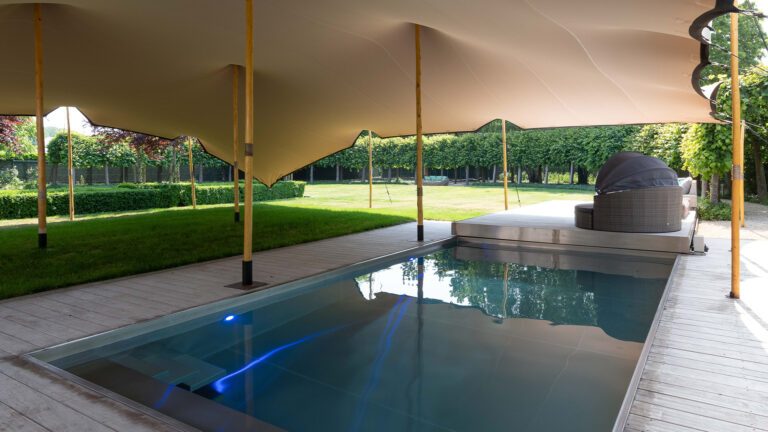 Onze klanten blijven ons verbazen. In Alken realiseerden we dit “oriëntaals” project, waar we een inox zwembad installeerden met een verrijdbare vlonder en overdekking met een nomadentent. Hierdoor werd een geborgen sfeer gecreëerd, alsof je vertoeft in een rustgevende en veilige oase.