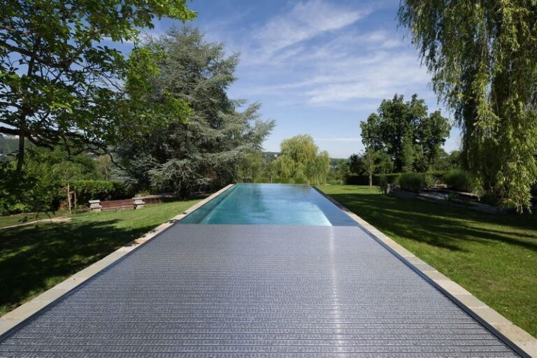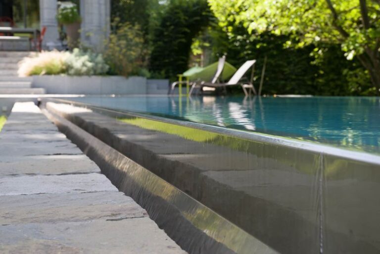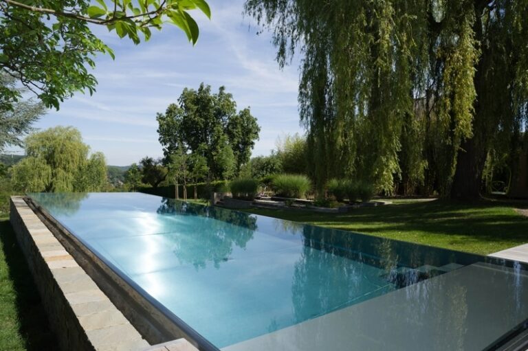 Op de helling van een deelgemeente van de stad Luik, ligt dit letterlijk schitterend zwembad. Het wateroppervlak weerspiegelt de omgeving op magische wijze. Met een spectaculair uitzicht op de Maasvallei, beleef je in deze infinity pool een intens gevoel van vrijheid. Het overloopsysteem op de vier zijden zorgt voor een perfecte afvoer van bladeren uit de boomrijke tuin en garandeert kristalhelder water.