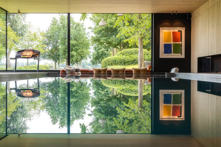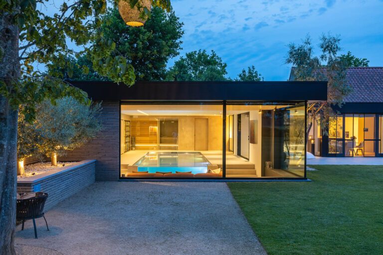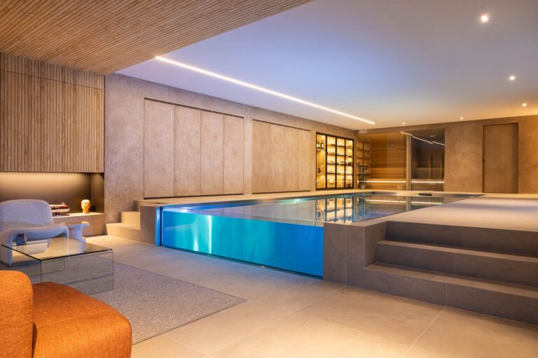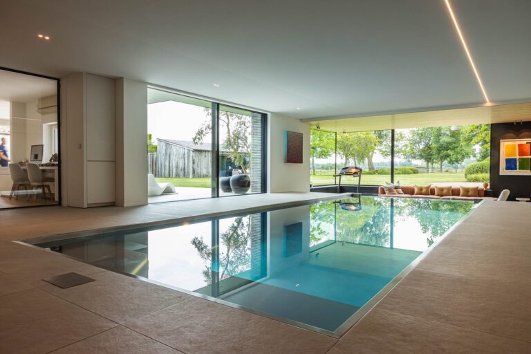 Full option graag? Ja, dat kan. In de toeristische trekpleister Damme, vinden we dit betoverend pareltje terug. Een prachtig binnenzwembad uit RVS voor 365 dagen zwemplezier. In de gezellige ruimte werd het niveauverschil aangewend om het bad in al zijn glorie te laten pronken met een indrukwekkende transparante wand. Bij avond schittert de kleurenpracht van de edelstalen wanden die beschenen worden door LED-spots en is het zicht vanuit de tuin bekoorlijk mooi.