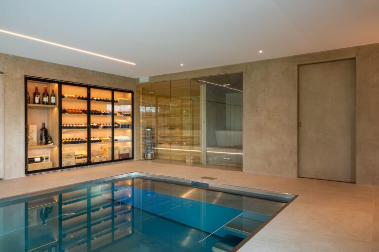 Een sauna en stoomcabine vormen de ideale aanvulling voor deze ultieme wellnesskamer. Na een verfrissende plons kunnen naast de gezellige gashaard exquise wijnen worden gedegusteerd die uit de ingebouwde wijnbewaarkast komen. Geef toe, als je hier niet volledig happy & relaxed wordt, word je het nergens.