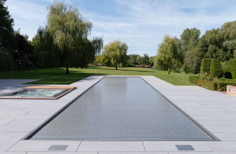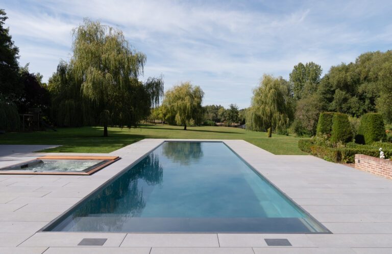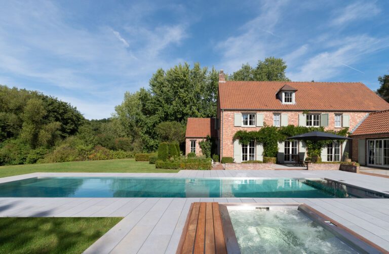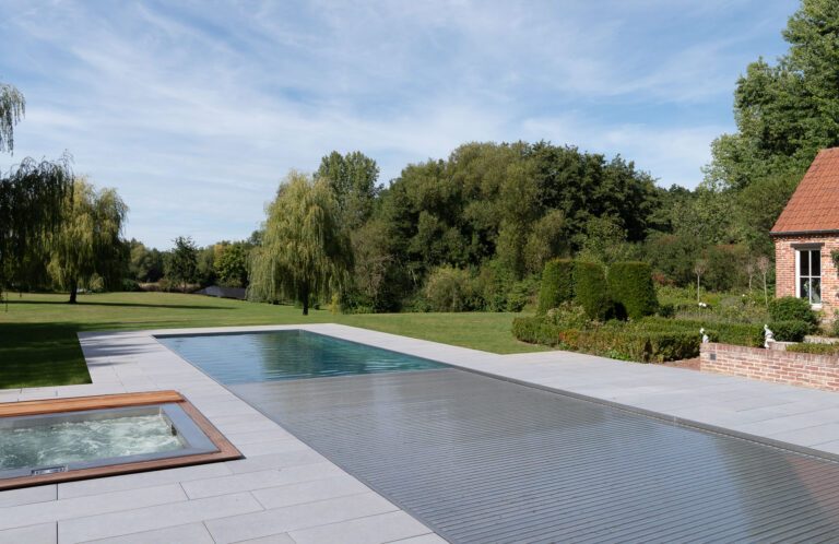 Om volledige overeenstemming in materiaal en eigenschappen te bereiken, koos de eigenaar voor een inox jacuzzi op maat die net naast het zwembad werd geplaatst. Hierdoor kan na het zwemmen meteen genoten worden van een herstellende hydromassage.
