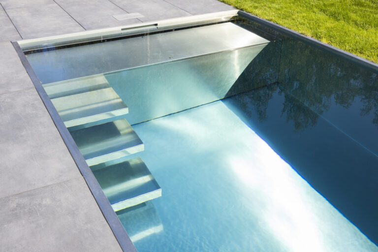 De zonnestralen die weerkaatsen op de wanden en bodem van een RVS-inox zwembad zorgen voor een prachtig schouwspel van licht en kleuren. Naargelang de samenstelling van de hemel, krijg je azuurblauwe, turquoise of staalgrijze reflecties … een feest voor het oog