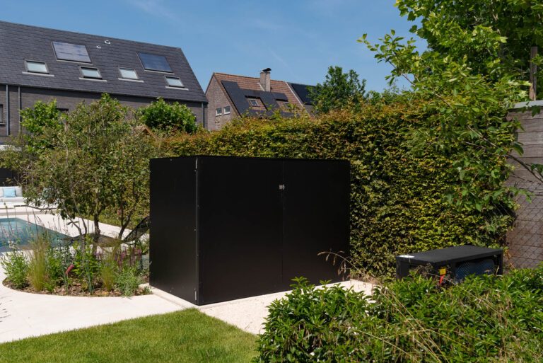 Wegens plaatsgebrek bouwden we een volledige metalen berging waarin alle zwembadtechnieken werden opgesteld. Het geheel is geïsoleerd en afgewerkt met aluminium bekleding met zwarte poederlak. Een elegante en praktische oplossing, discreet opgesteld in de tuin.
