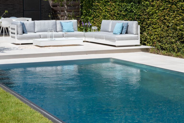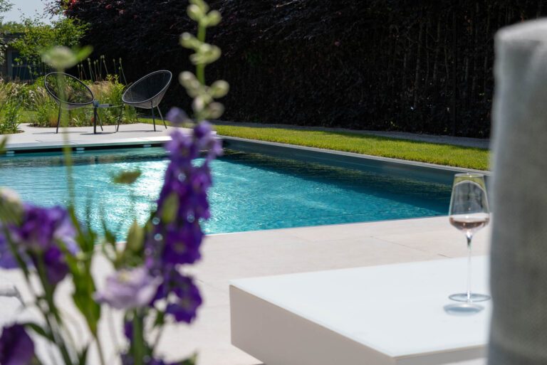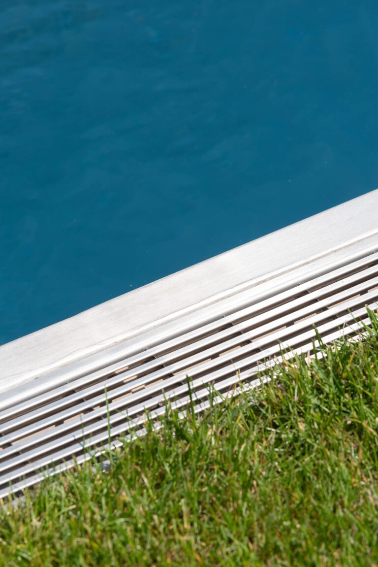 Aan één zijkant werd een overloopgoot voorzien om waterverlies bij plonzen te voorkomen en gras uit het bad te houden. De randafwerking is niet enkel stijlvol maar garandeert ook voldoende ruimte voor lounge en terras.