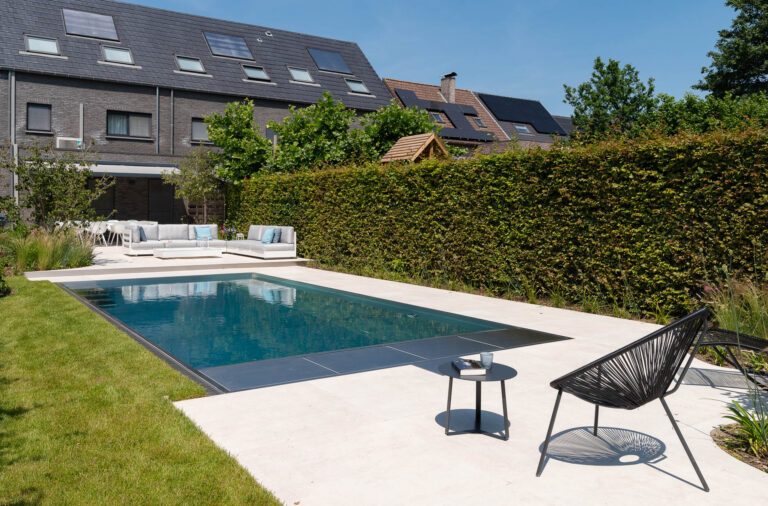 In deze compacte tuin van een half-open bebouwing in Berlaar werd de ruimte optimaal ingevuld met een klassevol inox zwembad. De rolluiknis werd achteraan het bad voorzien waardoor de volledige lengte kan benut worden om baantjes te trekken.