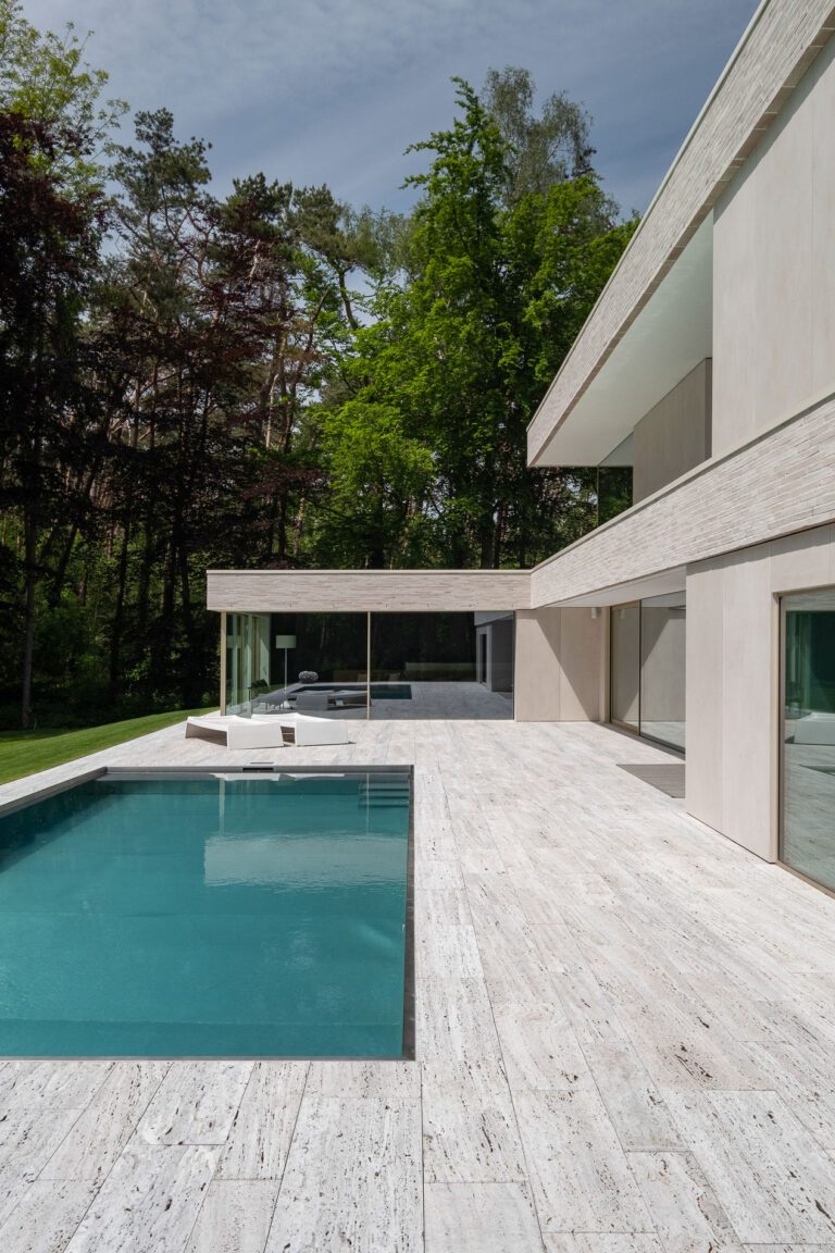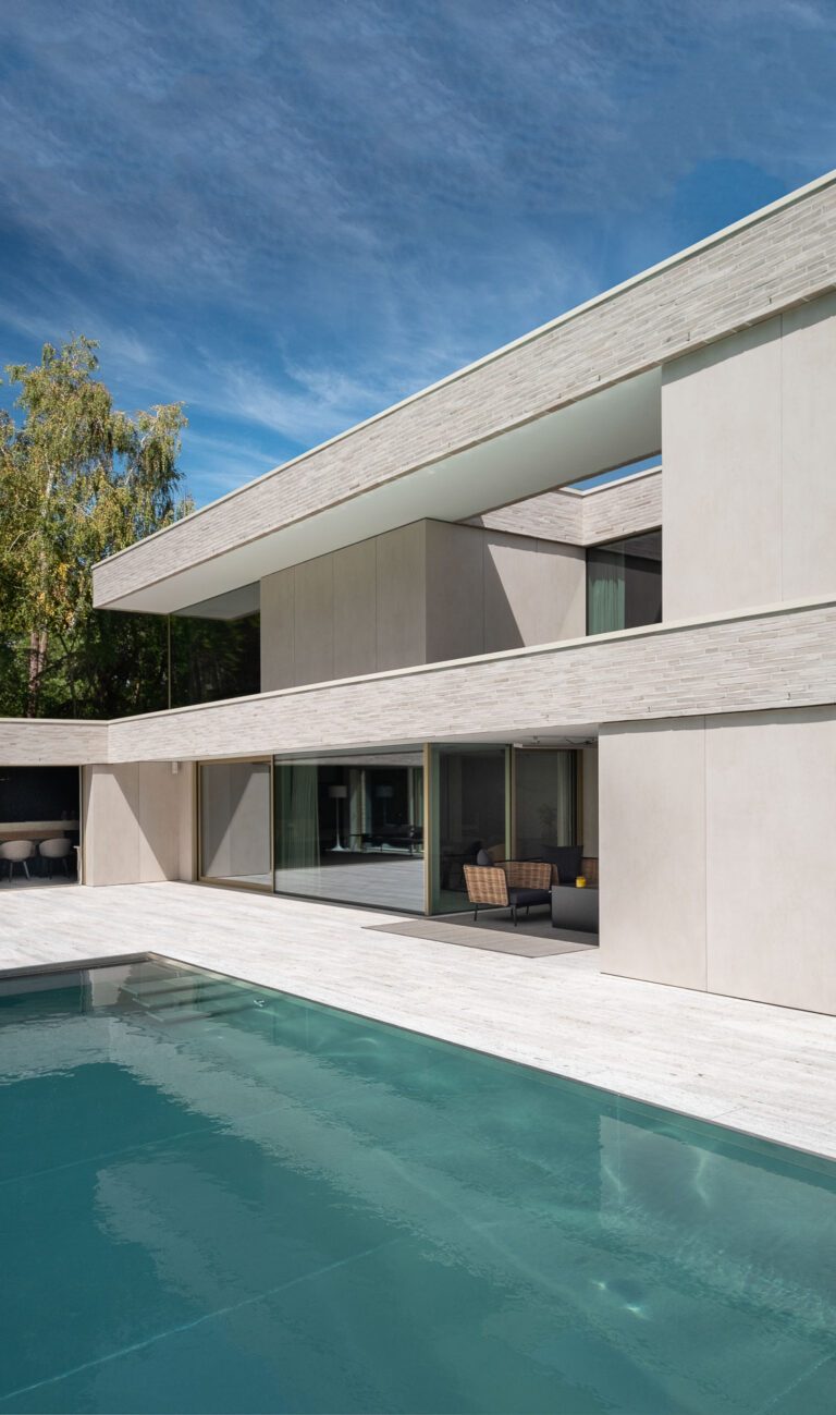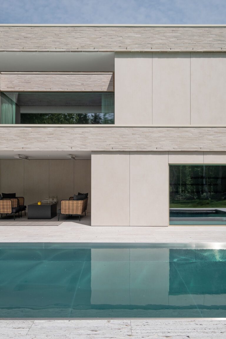 De gevel werd opgetrokken uit keramische wandpanelen en bakstenen met overeenkomstige kleuren en gaan optimaal samen met de travertin natuursteen van het terras. De combinatie met het inox edelmetaal van het zwembad resulteert in een uniek en oogverblindend kleurenspel.