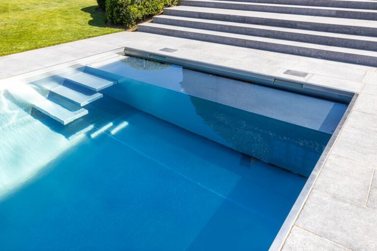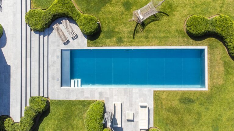 Hoewel imposant aanwezig, gaat het inox zwembad foutloos samen met de architectuur en tuininrichting van deze landelijke villa. De zonnestralen die weerkaatsen op de wanden en bodem zorgen voor een prachtig schouwspel van licht en azuurblauwe, turquoise of staalgrijze kleuren.