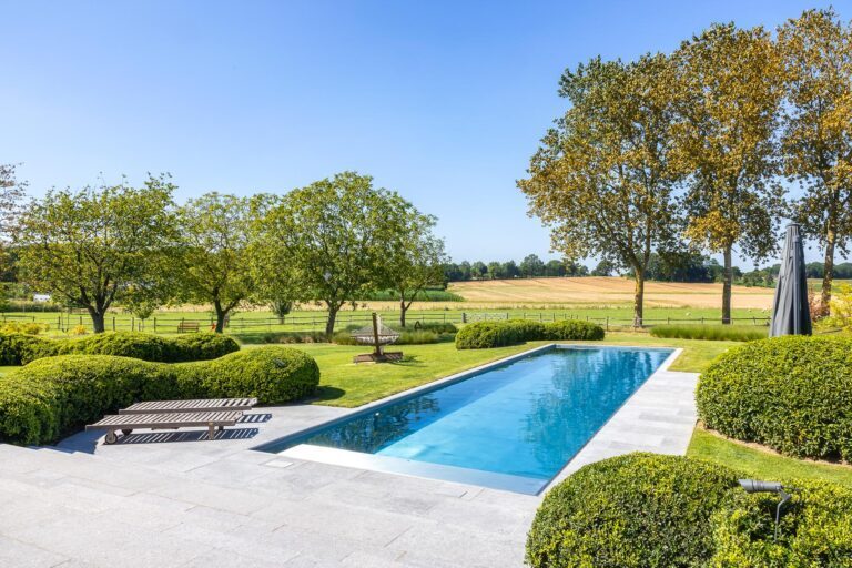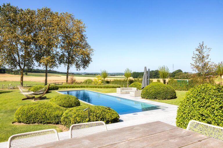Het uitzicht in deze tuin is betoverend mooi met vergezichten op de achterliggende landerijen. De buxushagen werden in organische vorm gesnoeid en verzachten hierdoor de strakke lijnen van dit 15 m lange inox zwembad.