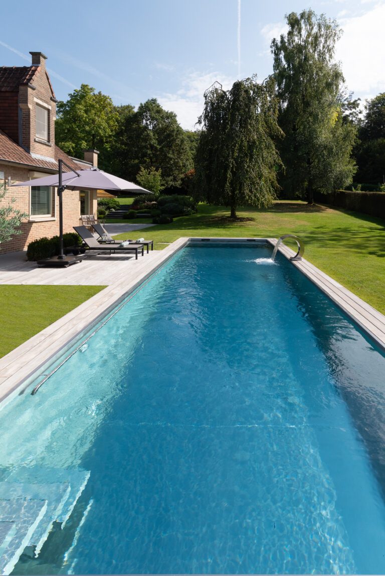 In een tuin in Waals-Brabant werd dit maatwerk inox-bad geplaatst van 13 x 3,5m. De ranke stijl van het bad wordt geaccentueerd door een smalle randafwerking rondom in hardhout. Een discrete opberging van het lamellendeksel achteraan het bad laat toe om de zwevende traptreden in al hun elegantie zichtbaar te maken.