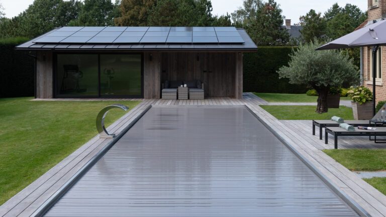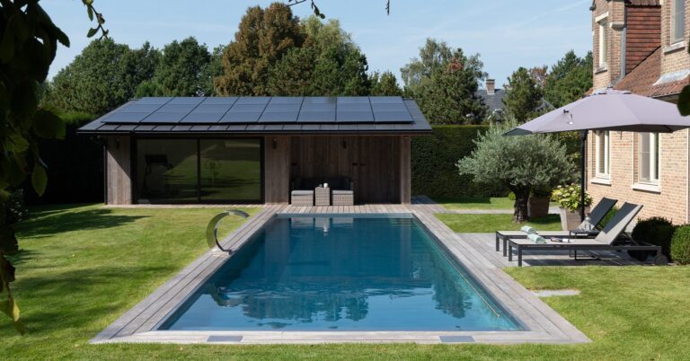 De geïntegreerde fontein voegt een rustgevend element toe aan uw badervaring. Naast het aangename geluid van het stromende water biedt de fontein een deugddoende hals- en schoudermassage, perfect voor ontspanning na een lange dag. Het plaatje werd volledig gemaakt door toevoeging van een poolhouse met een overdekt terras en binnenin een fitnessruimte. De zonnepanelen, die intelligent gekoppeld zijn aan de zwembadtechnieken, beperken de energiekost tot een absoluut minimum.
