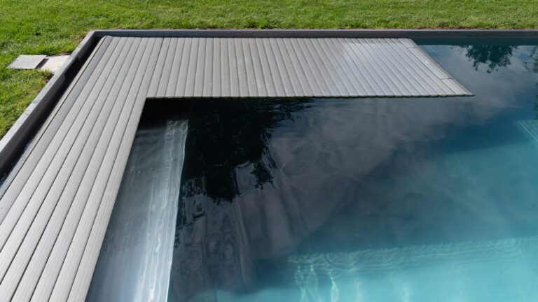 De aangepaste PC-Solar rolluik biedt niet alleen bescherming, maar helpt ook bij het behoud van de watertemperatuur, waardoor u het hele seizoen door van uw zwembad en jacuzzi kunt genieten. De elegante hoektrap voegt een verfijnd element toe aan het design en biedt een stijlvolle toegang tot het water.