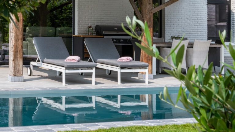 Het zwembad vormt een mooi contrast met de landelijke stijl van de woning en is een elegante aanvulling op de tuin. De combinatie van moderne elementen met de natuurlijke charme van de omgeving creëert een harmonieuze en uitnodigende sfeer.