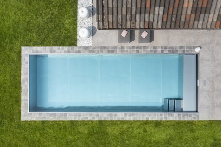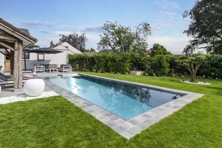 Ervaar de luxe van dit maatwerk zwembad van 10 x 3,5 meter, perfect afgestemd op de unieke kenmerken van deze woning. Dit zwembad is uitgerust met een PC-Solar afdekking in een rolluikbak/plage, aangevuld met een zwevende trap dat het ontwerp een modern tintje geeft.