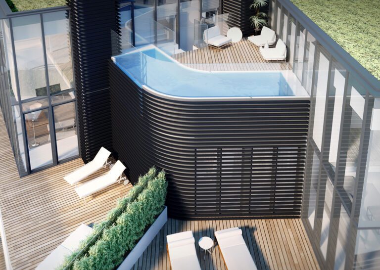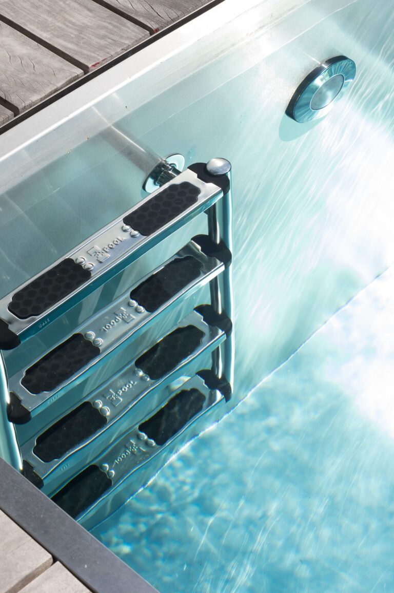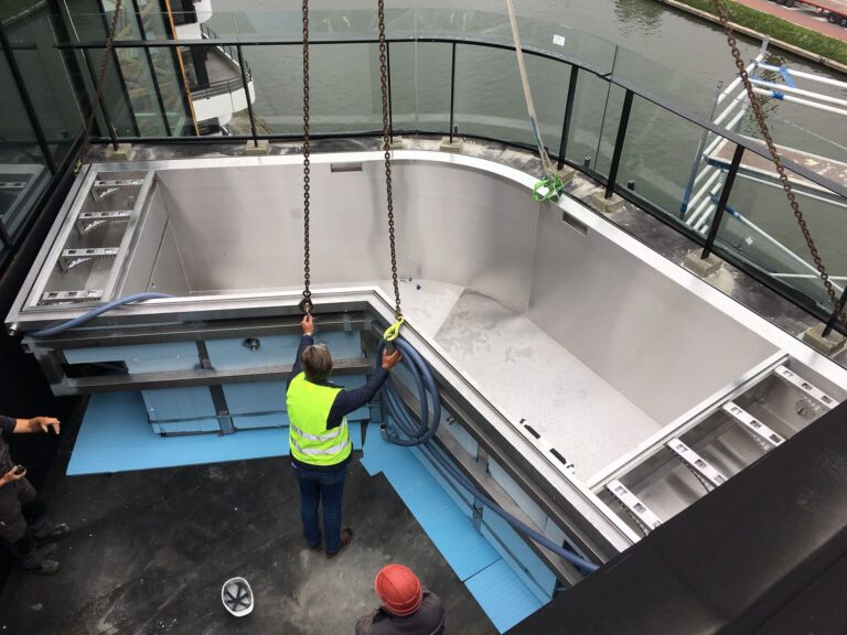 Een meesterwerk in inox. Voor het tweede inox zwembad in Zuidzicht – Hasselt, creëerden we een unieke plungepool met een elegante, gebogen wand. De gespecialiseerde techniek van het walsen van de inox plaat resulteerde in een organische vorm die perfect aansluit bij de eisen van de architect en de moderne stijl van het penthouse.