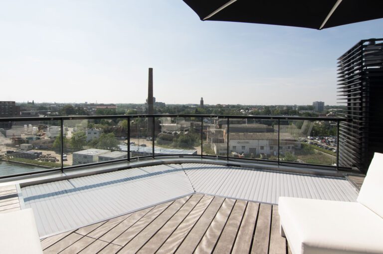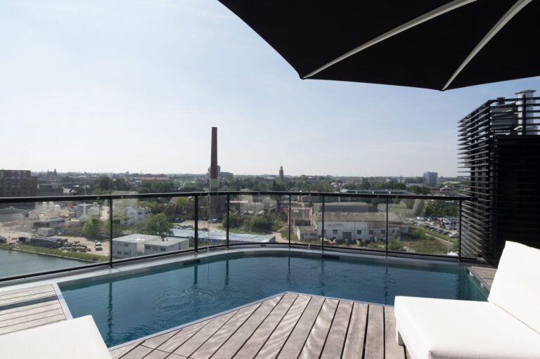 Ontspannen met een panoramisch uitzicht. Het banaanvormige rooftop zwembad op het penthouse in Zuidzicht biedt een unieke zwemervaring. De uitpandige gebogen wand en de hoogwaterlijnskimmers die het water tot op één centimeter onder de rand brengen creëren een gevoel van oneindigheid en een optische verbinding met de Kanaalkom.