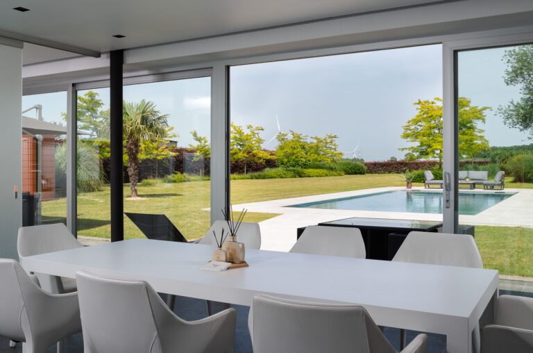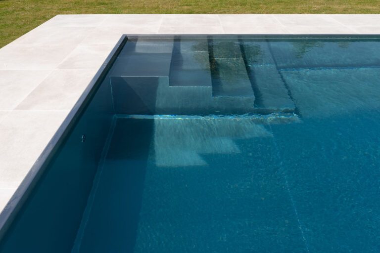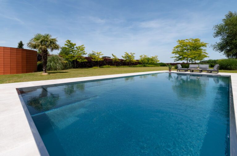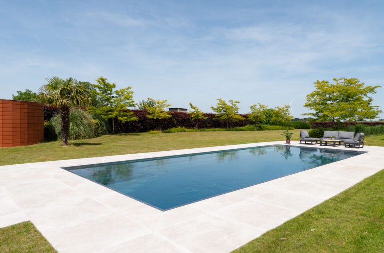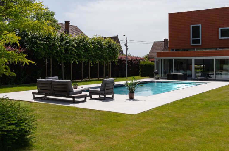 Het inox laat het zwembad er meteen exclusief en luxueus uitzien en zorgt voor een niet te evenaren schittering op het wateroppervlak. Dankzij de hoge waterlijn krijgt het geheel een strakke, moderne uitstraling die naadloos past bij de opvallende architectuur van de woning.