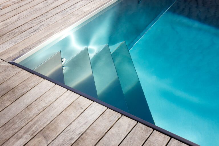 De nieuwe gracieuze hoektrap biedt een elegante en gemakkelijke toegang tot het water. Deze toevoeging is niet alleen functioneel, maar draagt ook bij aan het stijlvolle ontwerp van het zwembad. Een ware blikvanger die het geheel naar een hoger niveau tilt.