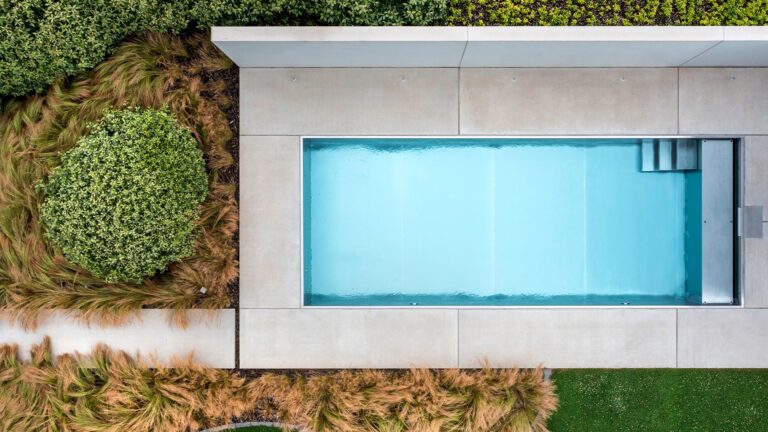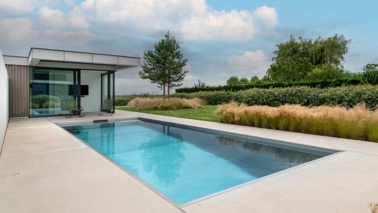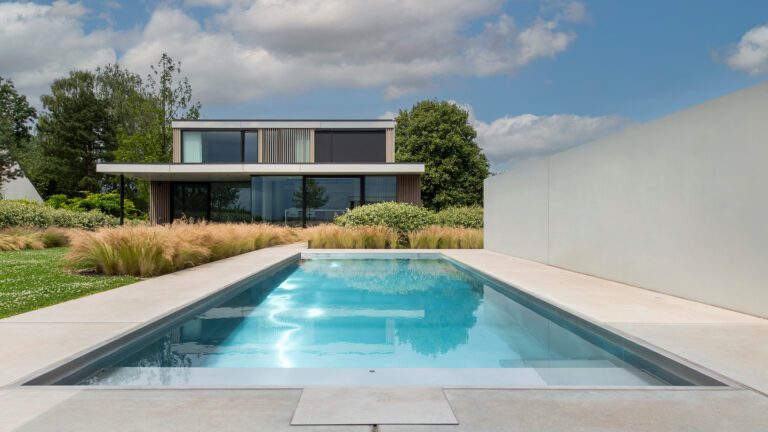De randafwerking van gepolijst vormbeton geeft het zwembad een eigentijdse uitstraling en zorgt voor een strakke, moderne look die perfect aansluit bij de architectuur van de villa en de tuin. Deze duurzame afwerking versterkt de elegantie van het zwembad en is een visueel spektakel in elke omgeving.